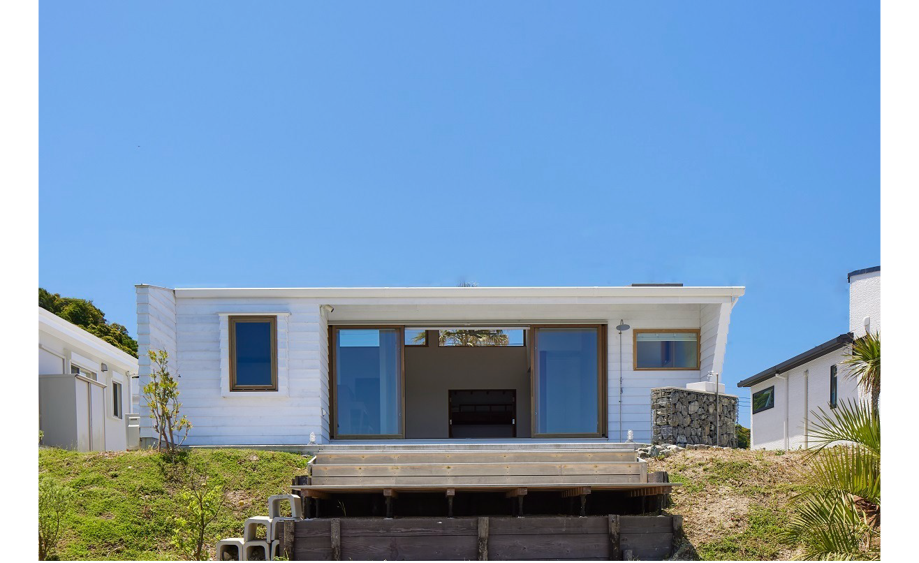 白い外観と水平に伸びる構成は、海辺の風景に静かに溶け込みながらこの場所ならではの暮らしを穏やかに包み込んでいます。