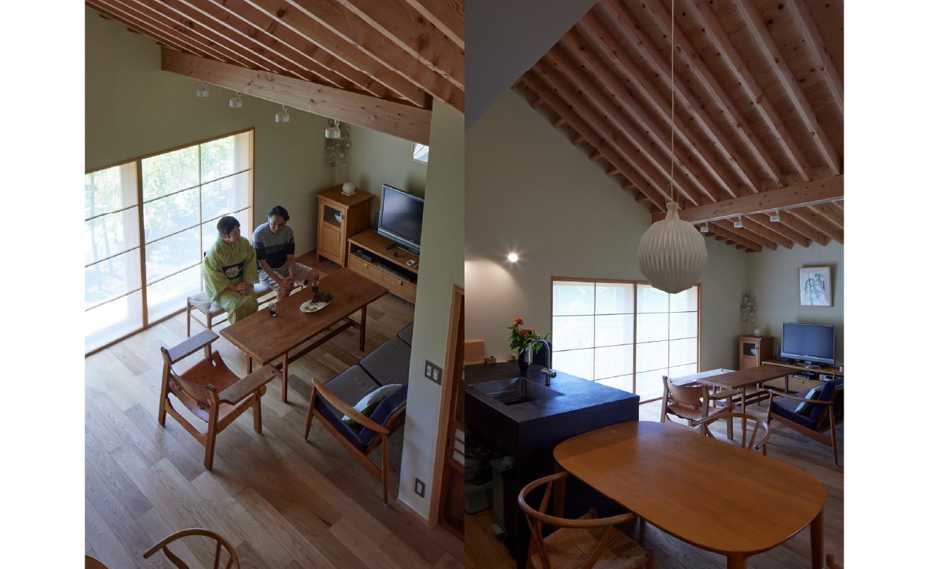 居間に設けられた障子はすべて壁の中に引き込めるよう計画。障子紙ではなく網状の和紙を用いることで網戸と障子を兼ねた建具とし、一般的な障子よりも高い透け感を確保しています。閉じていても光や気配を遮断しすぎず開けば存在を消す。この可変性が内と外の境界を柔らかく曖昧にしているのです。