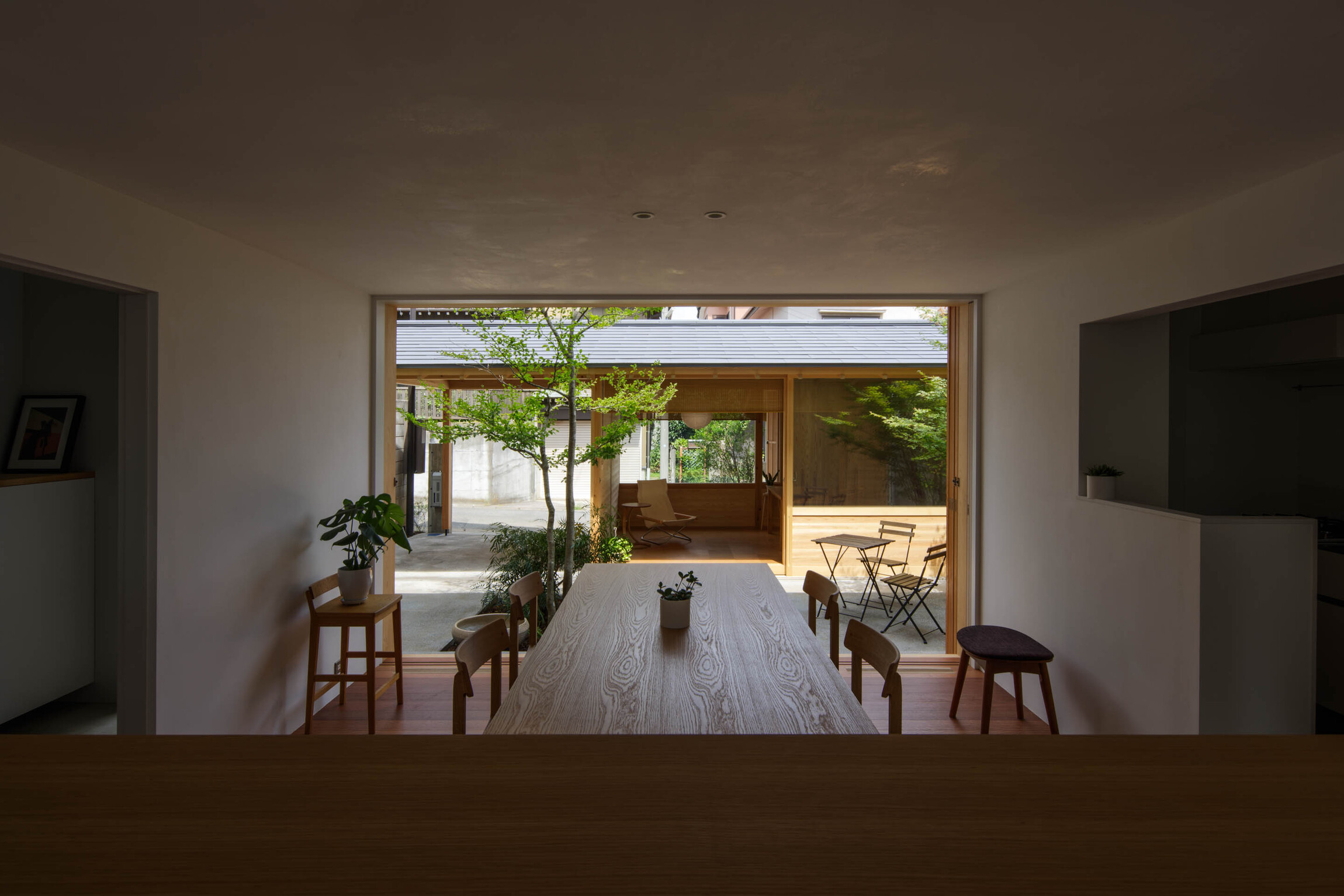 駅に近く住宅が立ち並ぶ環境のなか、道路側に離れを設け、主屋を敷地の奥へ配置することで、プライバシーを確保しながらも、大きく開いた暮らしが実現しました。