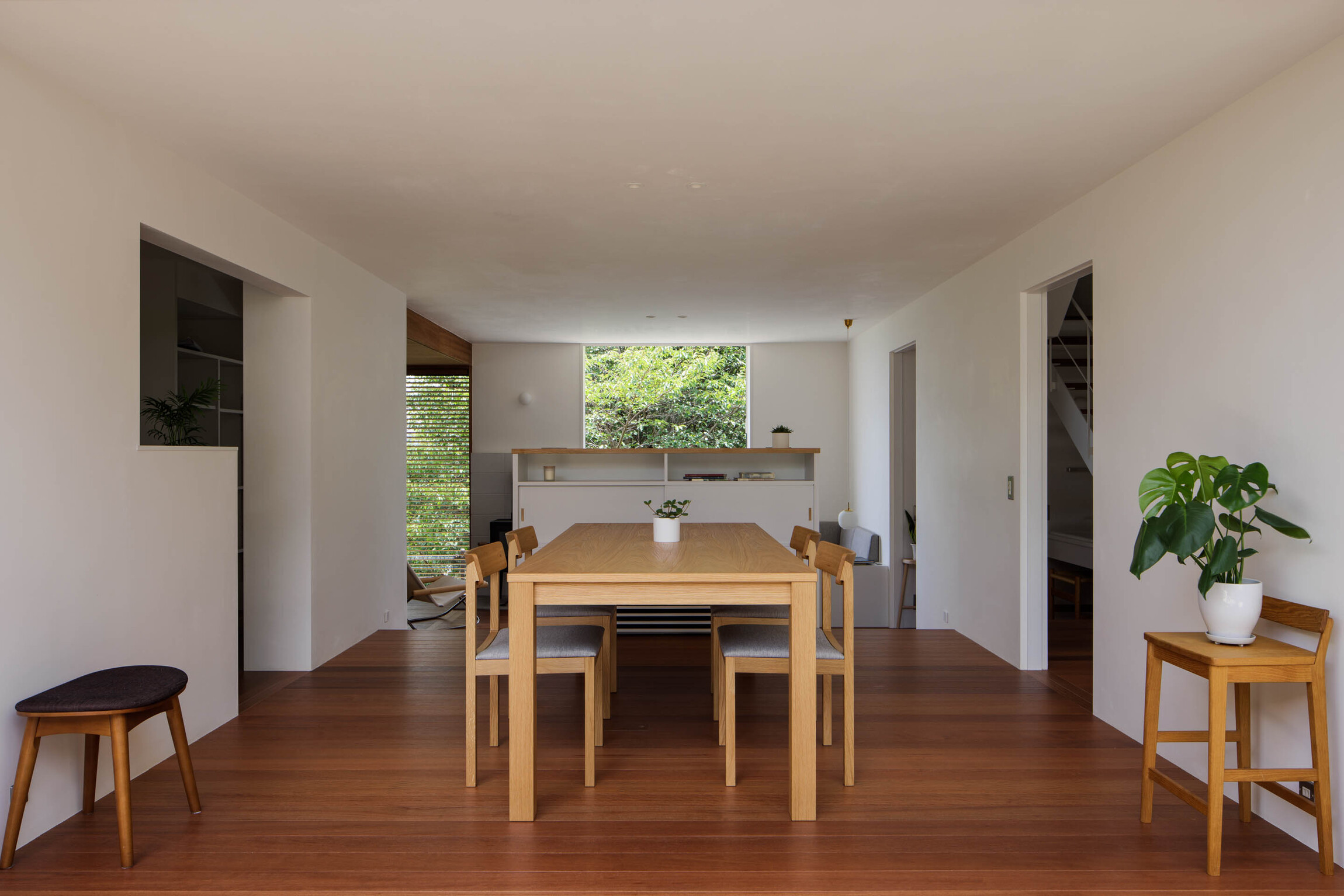 高台という敷地環境から、気持ちのよい風が南北方向に流れます。その風の流れを遮らないよう、母屋の中庭側に面する大開口は全開できる木製建具を。公園側の開口には全開できるアルミサッシを採用し、住まいのなかを風が通り抜ける設計としました。風は、匂いや温度、音といったさまざまな知覚情報を室内に届けてくれるので、外で過ごしているような不思議な感覚が生まれます。