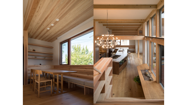 たとえば、スタディースペースのカウンターの角を斜めにカットすることで、引っかかりがなくなり人の動きをスムーズにします。また、ダイニングに設けた壁付けのベンチは、省スペース化を図りながら、背もたれとなる壁を斜めにすることで座り心地が向上。窓の外へと視線が抜け家族のお気に入りのスペースに。
