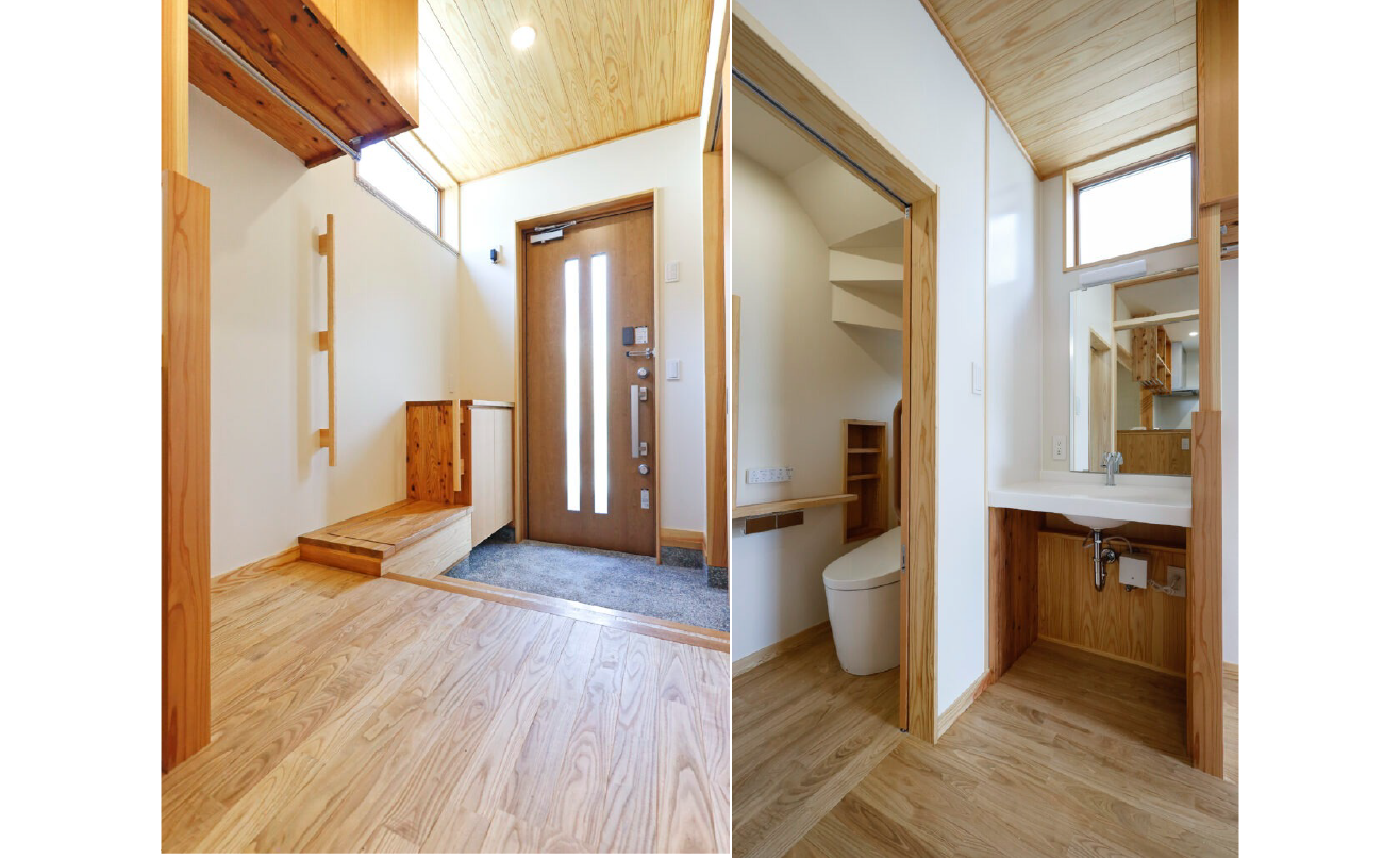 浴室はハーフバス仕様とし、下部はユニット、壁や天井には水に強いカナダスギを採用。座ったときに正面に緑が入るよう窓を設け、入浴中も森の気配を感じられる空間としています。