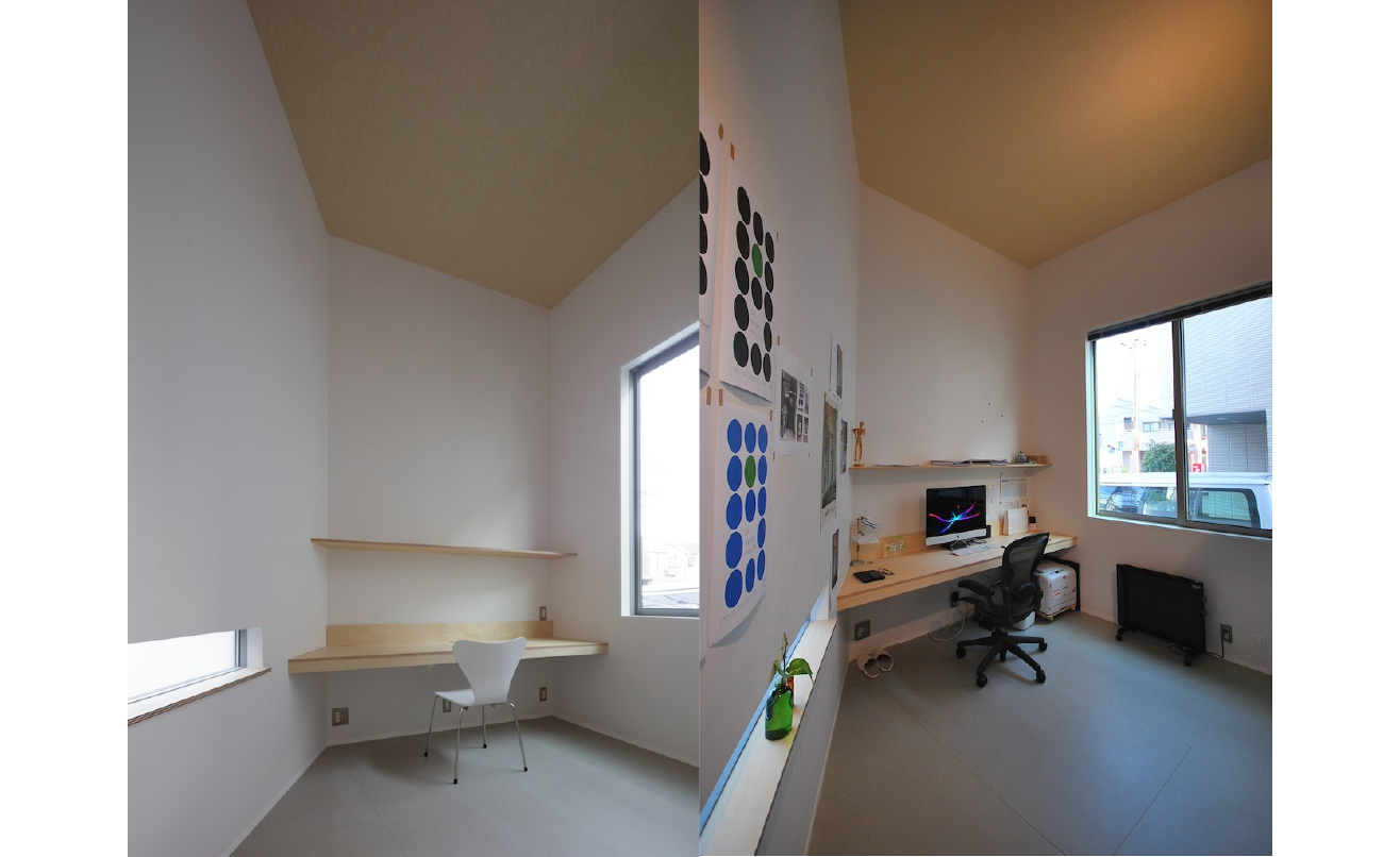 このアトリエ付き住宅では、空間の印象を決定づける要素として天井や仕上げの扱いが丁寧に設計されています。目立つ素材を使うのではなく、限られたコストの中でどこに操作を加えるか ── その判断の積み重ねが、空間の質を支えています。
