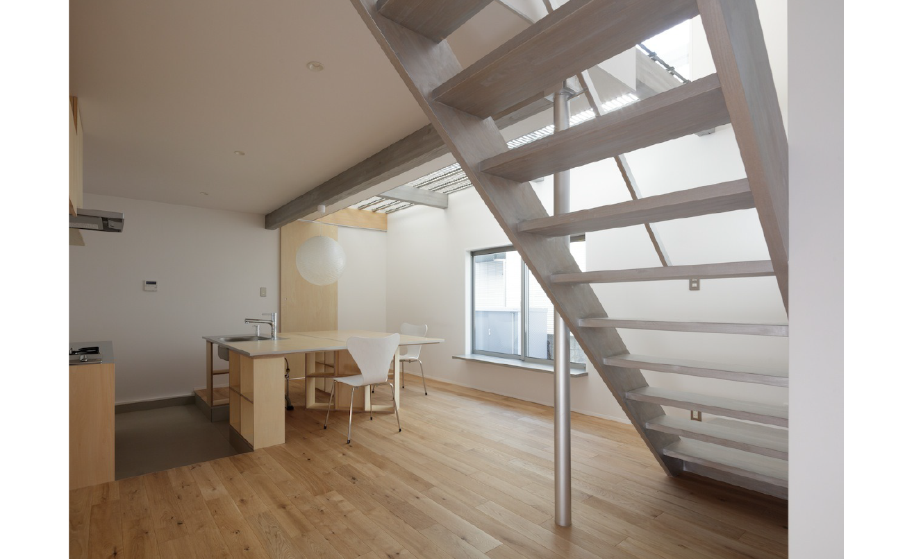 主室の上部に設けられたルーバー状の天井は、この住宅を象徴する仕掛けのひとつです。金属製の床材を用い、2階の床として踏むことができる強度を確保しながら、下階へと光を落とす役割を担っています。