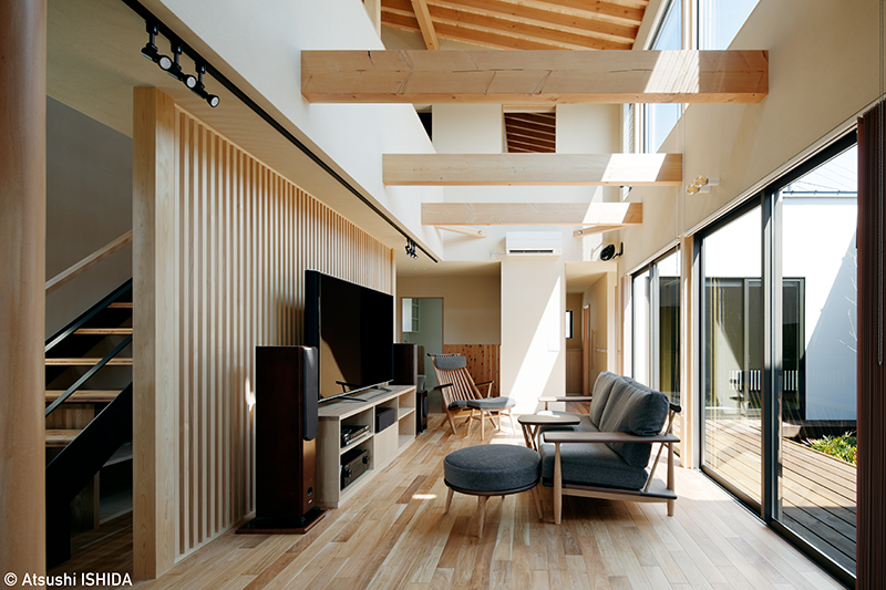 周囲の視線を気にせず、やわらかな光を日常の中で感じたいという思いから、中庭を中心に据えた設計が選ばれました。中庭は各室に安定した明るさをもたらすだけでなく、外部からの視線を遮り、想像以上の安心感と開放感を生んでいます。