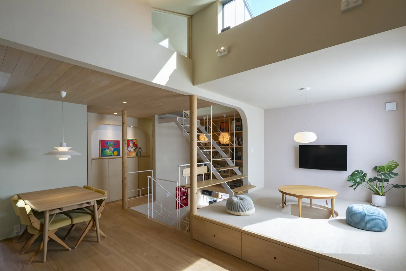 敷地は決して広くないことから、壁で細かく仕切るのではなく、スキップフロアや小上がりで高低差を持たせることで、役割を緩やかに分けています。さらに、備え付けのスタディコーナーやベンチを設けることで、居場所を点在させました。
