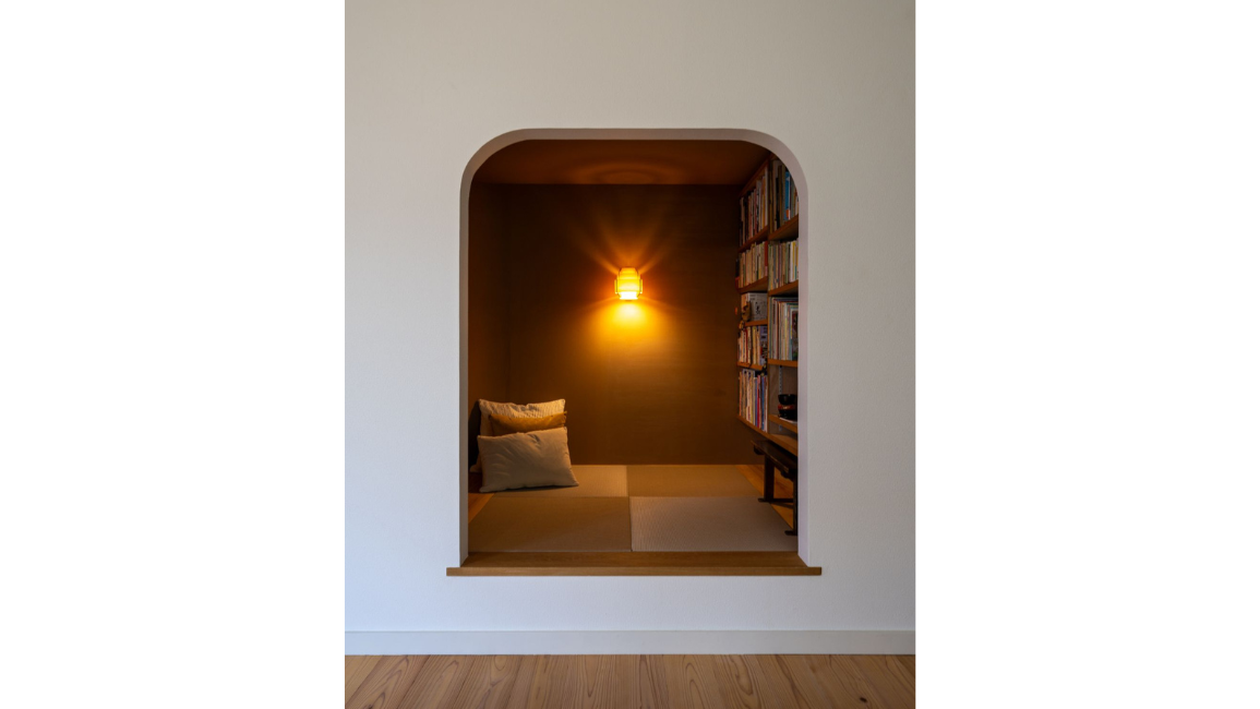 さらに、広がりのあるLDKの一角に、約30センチ床を上げた小上がりの畳スペースを設けました。塗り壁で仕上げた少しクローズドな空間で、横になったり読書をしたりと、静の時間を味わえます。