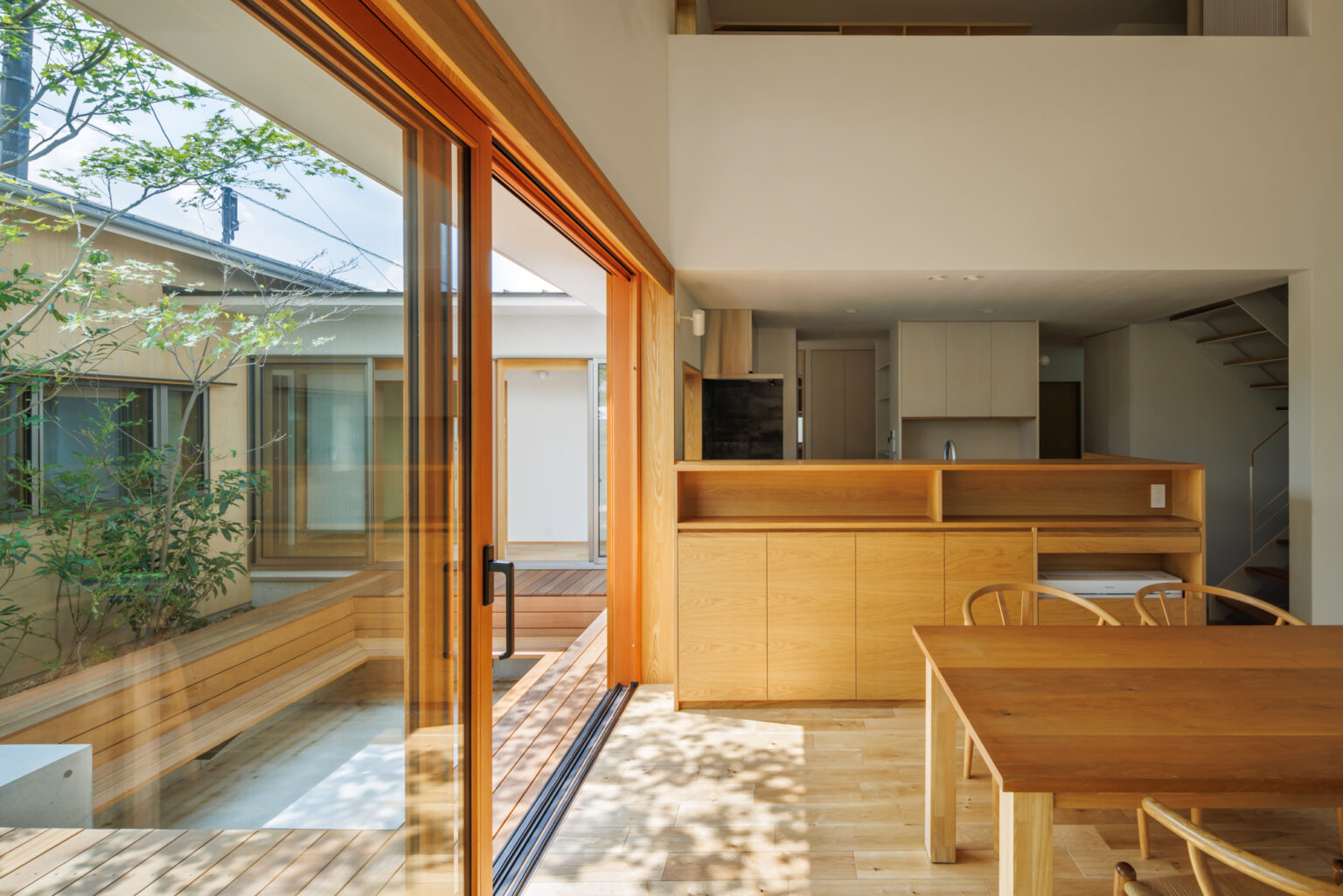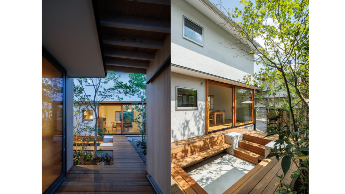 中庭はピットリビングとして少し沈み込ませ、デッキとベンチを一体化。リビングが延長するようなデザインで、家族が自然と集まります。