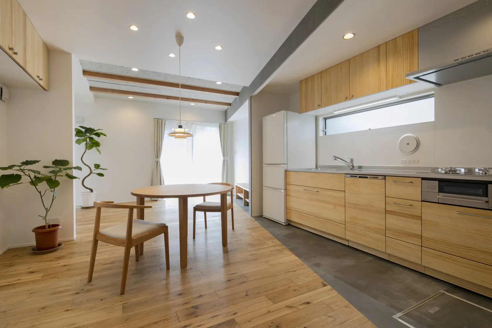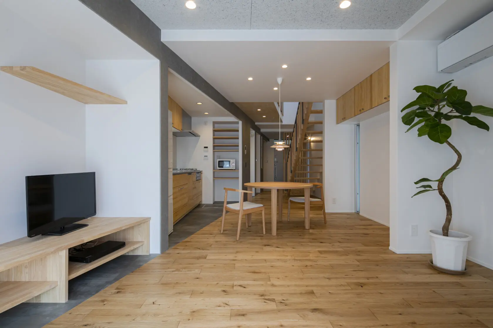 住宅密集地で横幅が狭く縦に長い敷地。いかに広く、立体的に感じる空間にするか、床、壁、天井ともに目の錯覚を利用し工夫した住宅です。
