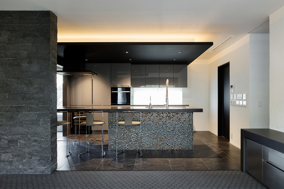 遊び心を兼ね備えた独創的な宙に浮いたデザインのキッチンカウンターは、明るい印象の他の部屋との差を出すため、天井を低くし間接照明を使って工夫しています。「ゴージャス感が欲しい」というご希望から、タイルにはゴールドが入ったものを採用。光の不合で表情が変わり、よりインパクトを与えました。