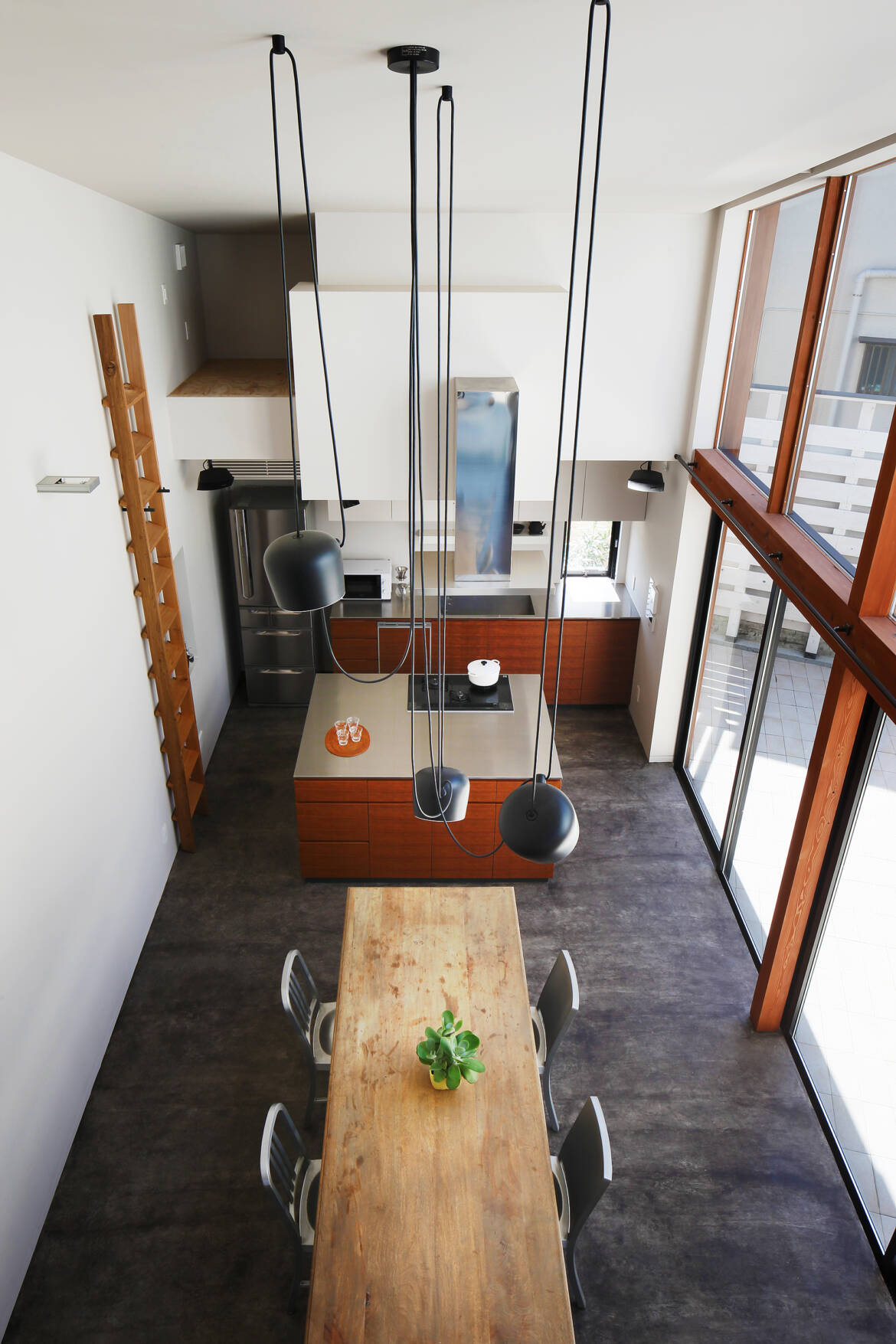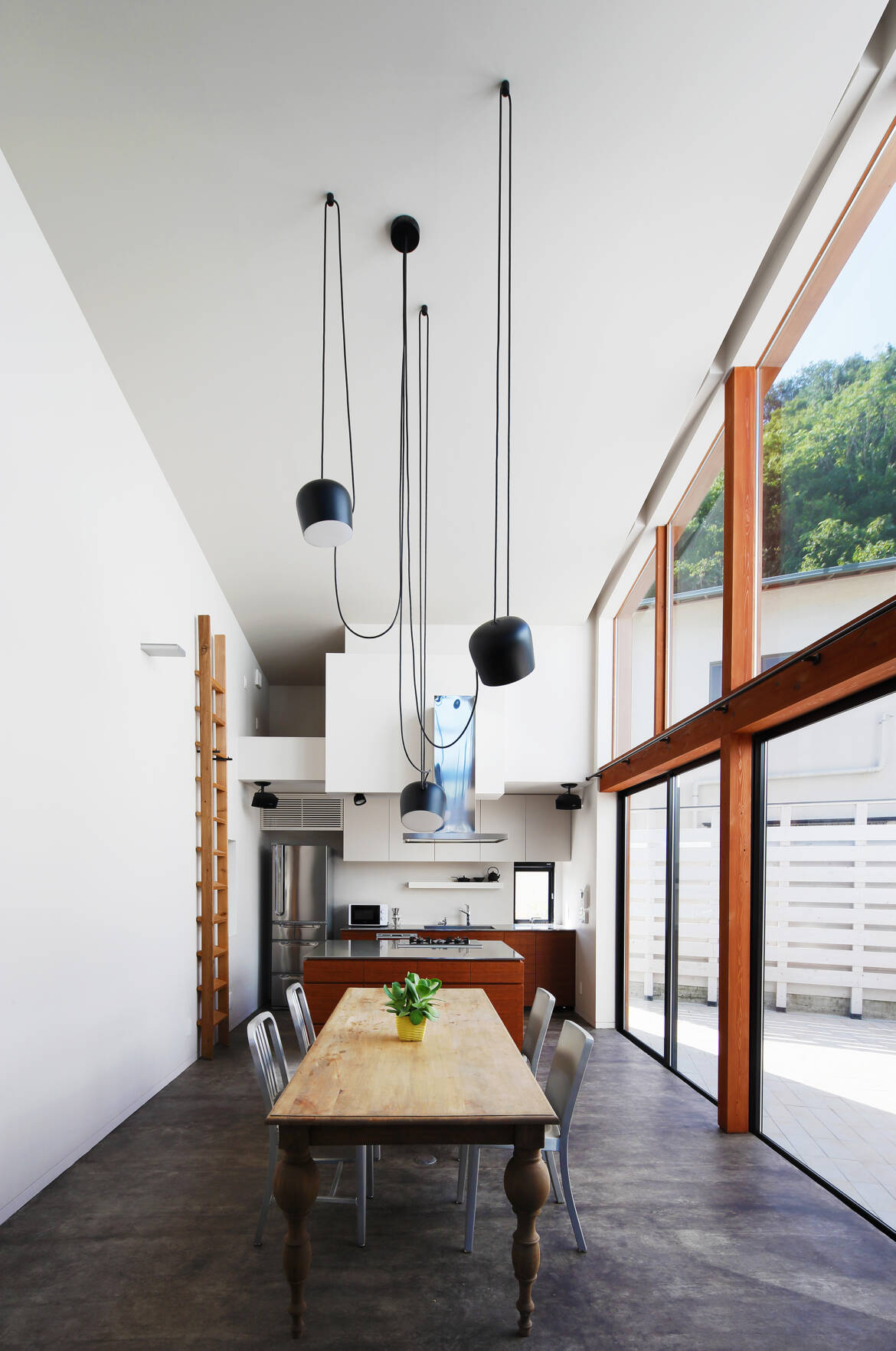 大開口の空間はとても気持ちの良いものですが、大きくなればサッシの存在感も増してきます。木の質感を活かした空間の場合、すべてを木製サッシにできればそれは美しいですが、大きな窓を木製サッシだけで揃えるとかなりコストがかさんでしまいます。そこで考えたのが吹き抜けの高い位置などのFIX窓の部分は木の枠を取り付け、掃き出し窓などの可動窓の部分はアルミサッシにするという方法です。これにより、コストを抑えながら木の空間のテイストを崩さず大開口を実現できます。