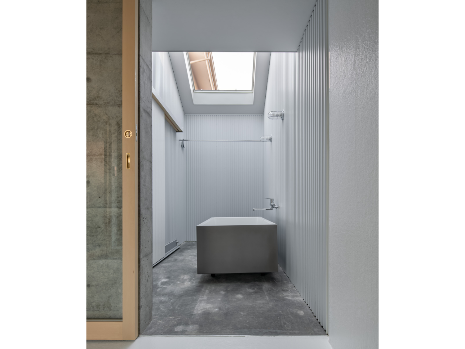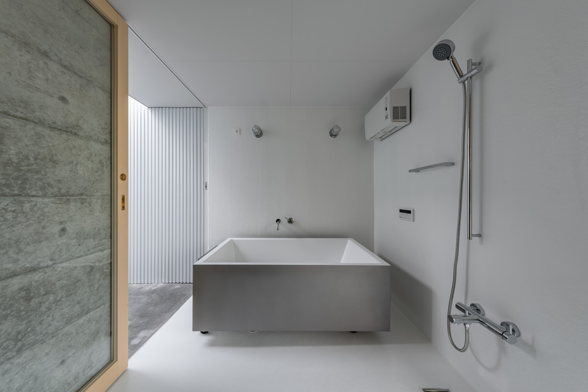 真っ白な空間に存在感のあるステンレスの浴槽は、保温性にとても優れています。特徴的な白い内側は汚れに強く、落ちやすいともされる特殊な白い塗装技術を使ったものです。今回の浴室を設計する際に相談し、キャスターを付けて頂きました。