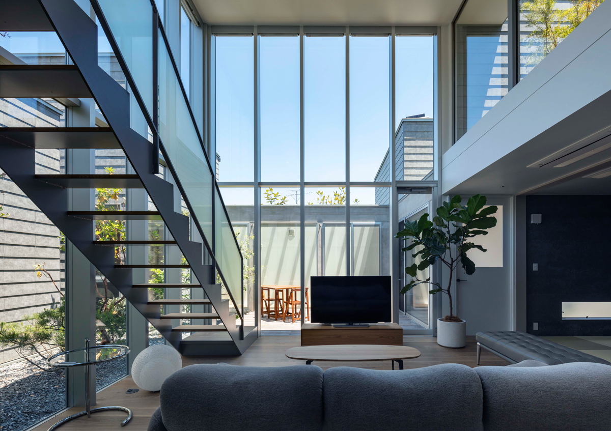 また、中庭のウッドデッキと植栽の部分をL字型に配置することで、室内外に一体感を持たせ、中庭を含む広がりのあるリビングとなりました。これに合わせて、サッシもL字型に配置。ビル用のサッシを採用することで、高さ5.25メートルの大きな窓が実現できました。