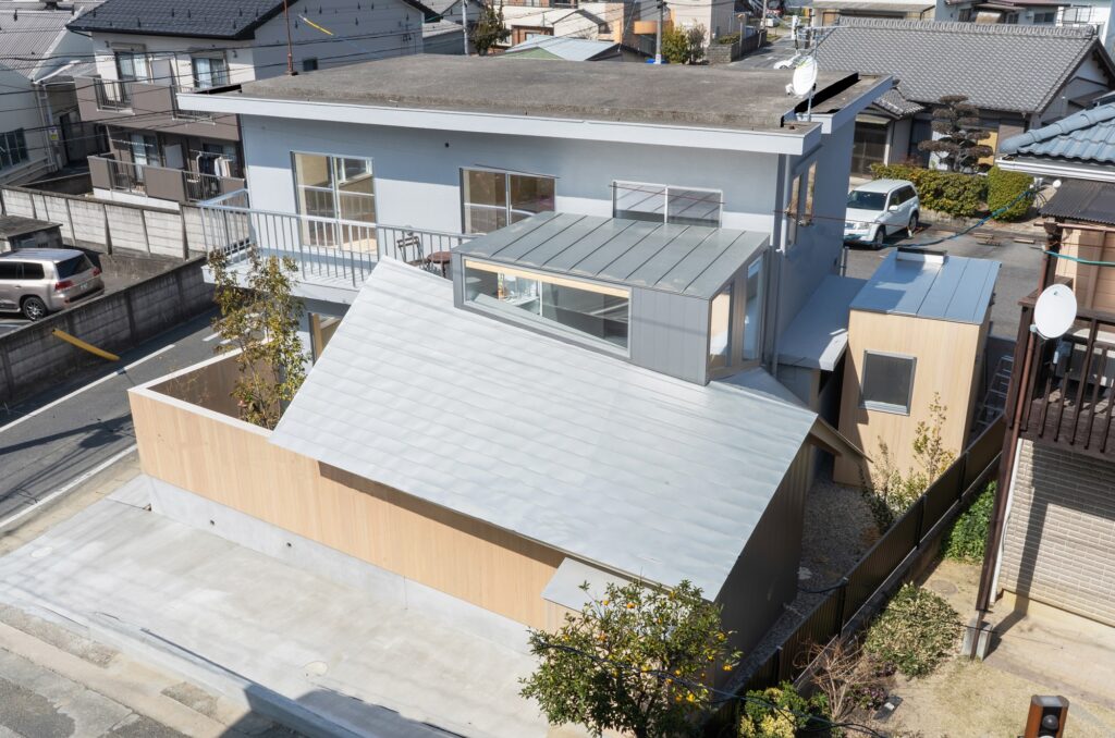 写真2枚目右側の小さな小屋のようなような部分がパントリーで、ここで靴を脱いで家に入ることができます。荷物が多くても玄関まで回らなくても済み、すぐに買ってきたものをしまえるという買い物動線を考えて設計しました。また、駐車場も含めて家全体がぐるりと回れる回遊動線になり、便利ですし、ちょっと楽しい工夫かと思います。