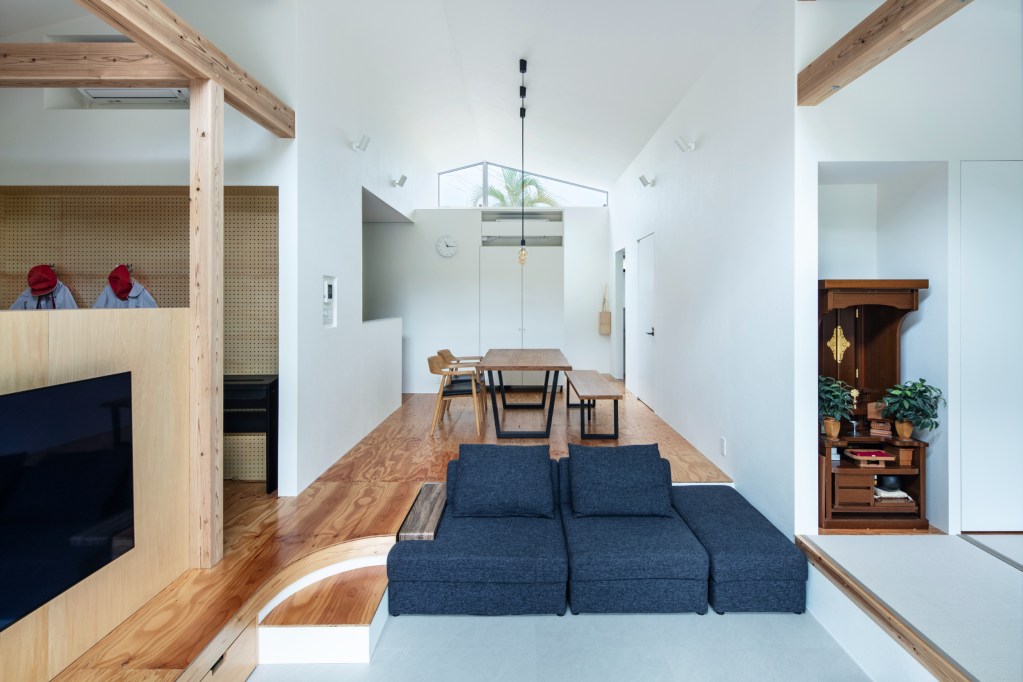 この建物以前にも『住倉』の2Fの床の一部も合板を荒く磨いた仕上げにしていました。ただ『奄美大島の家型』では、暮らしのメインとなるLDKの床で、まだ小さいお子さんもいらっしゃるという状況でしたので、ケガなどに繋がらないように、よりきめ細かく磨き、さらに塗装を4回程度塗り重ねました。施主の方も、サンプルなどは見ていましたが、完成まではドキドキしていた部分もあったようです。
