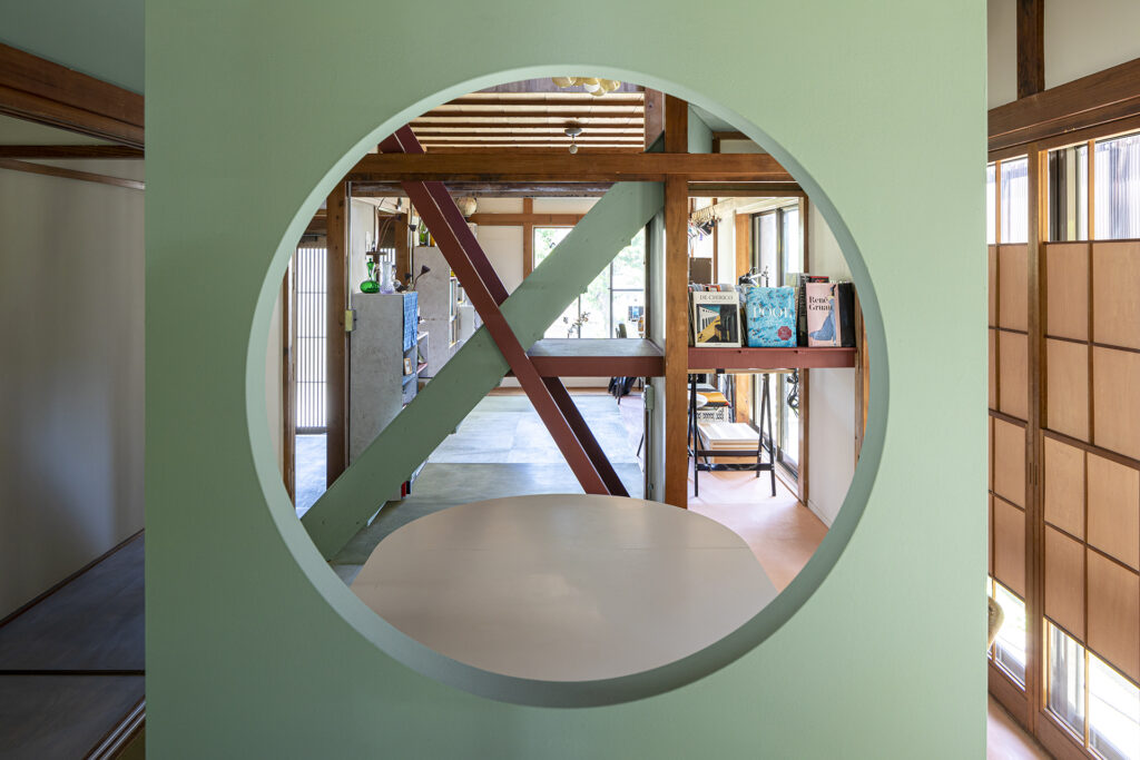 上部にくり抜いた丸窓が、空間だけでなく、元々の和の要素とプラスされたの洋の要素をつないでくれ、この家の象徴になっています。