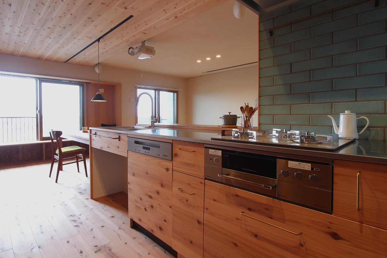 『大宮の家』では施主の方が無垢の木の扉が良いということだったので、杉でキッチンの扉と背面の食器棚の引き出し部分を揃えました。