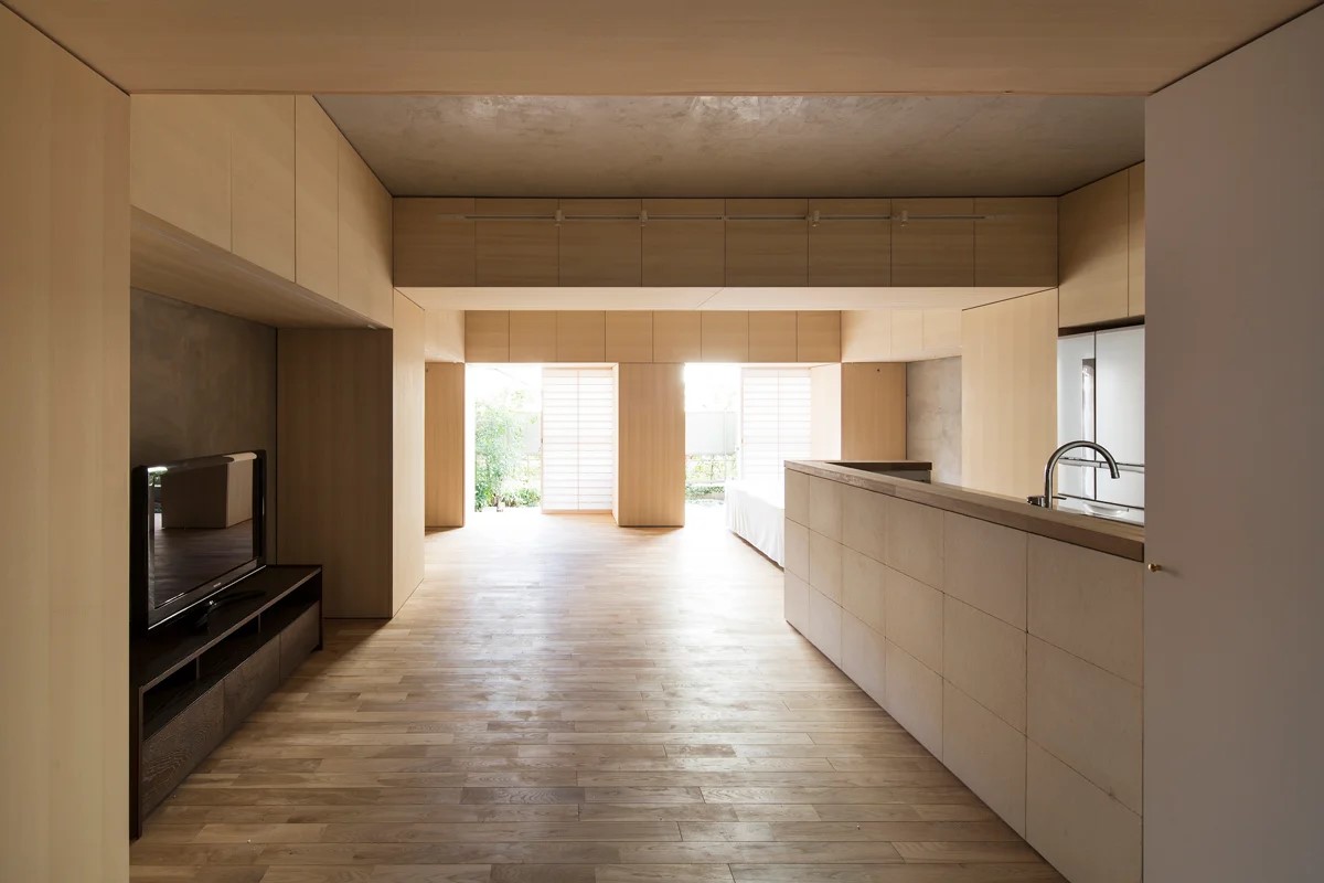 室内に出っ張っている柱梁に収納や設備スペースを集め、効率的に大きな収納をつくりながら、その他の部分の仕上げの嵩上げを極めて小さくすることで、居住空間を広くしています。それによって生まれた窪みは、机やベッドを配置するきっかけとなり、そこに住まい手の居場所がつくられていきます。そして居場所からはすぐに収納にアクセスできるため、常に綺麗な状態を保つことができます。