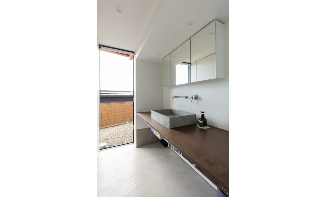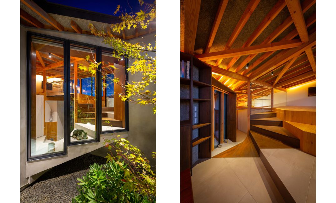 その中で、肝ともいえるのが家の中心部に設けた緩やかな螺旋階段です。庭の植栽を囲むようにL型に配した建物の、2方向の付け根にあたる部分にこの階段はあります。段差を昇る、降りるごとに、ワークスペースやリビングなど違う空間が展開し、窓の外には庭からテラスへと旋回しながら景色が開けていきます。