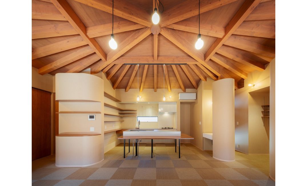 家の四隅から頂点に向かって梁を走らせ『かぶら束』を中心に据える木組みの工法で、家全体を包む天井と柱を落とさない大きなLDK空間を実現しました。