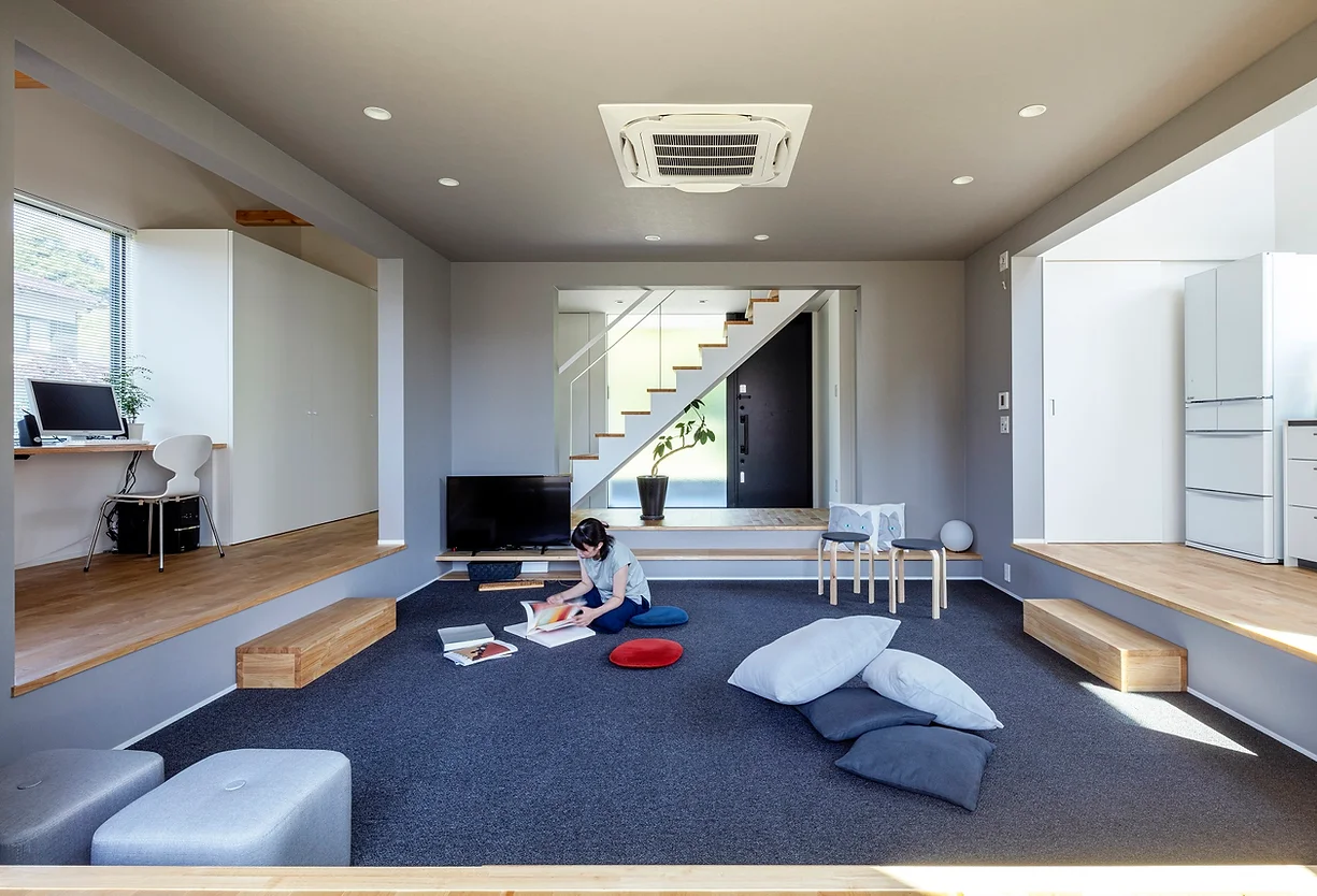 たくさんの友人を招いてボードゲームを楽しむ為、家の中心に広場のようなリビングを配置。上り口にある踏み台は集めてつなげるとボードゲーム用の机にもなります。 リビングを囲むように回遊性を持たせてつくった回廊スペースは、音楽の演奏のステージにも変身。一段下がったスペースを客席にして自宅でミニコンサートを開けるよう設計しました。