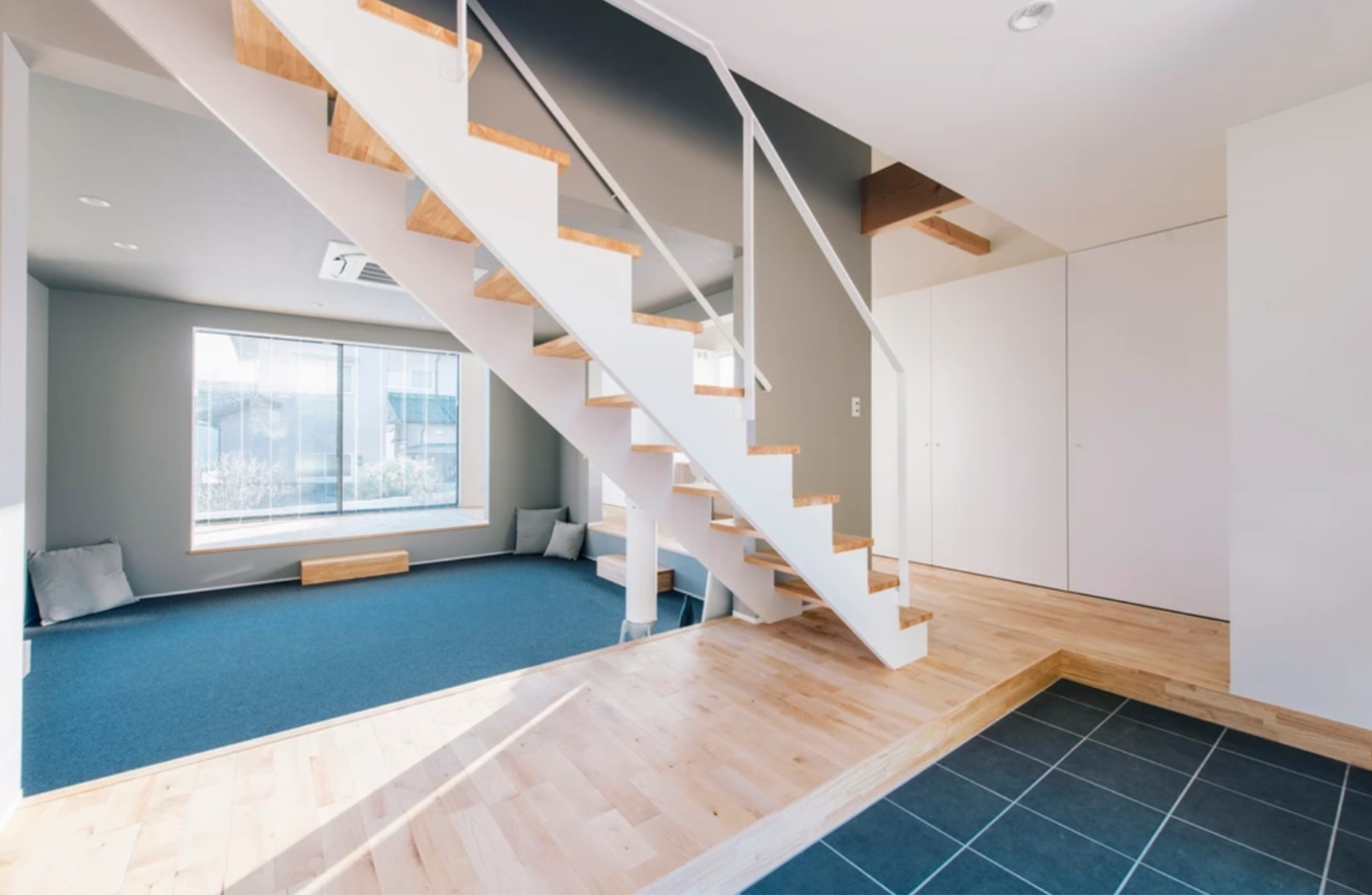 一段下がったリビングスペースは、キッチンからも様子が良く見えるので、子育て中も安心して家事ができます。タイルカーペットは、汚れると部分的に交換できるのも嬉しいポイントです。