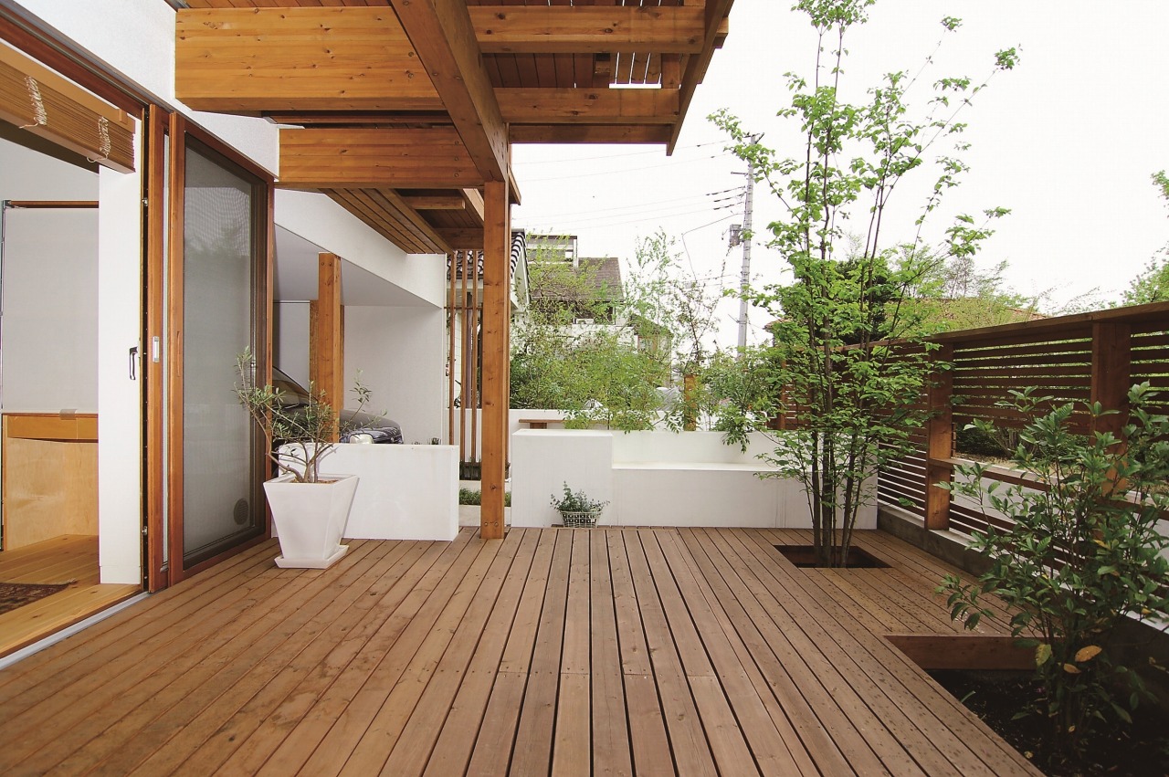 リビングと大きなバルコニーを一体化するために、幅2間分(約3.6メートル)の開口部に特殊な木製サッシを採用し、全てのサッシを引き込んで開放できるようにすることで、室内外が一つの空間として利用できるようにしました。 バルコニーでは、通常の高さ(約1.1メートル)の手すりを設置すると、リビングで腰掛けた時に富士山が見えなくなってしまうため、この住宅では手すりの高さを約70センチに抑え、さらに安全性を確保するためにベンチを設置しました。ベンチの奥行きを深く取ることで、安心感と快適さを両立させています。