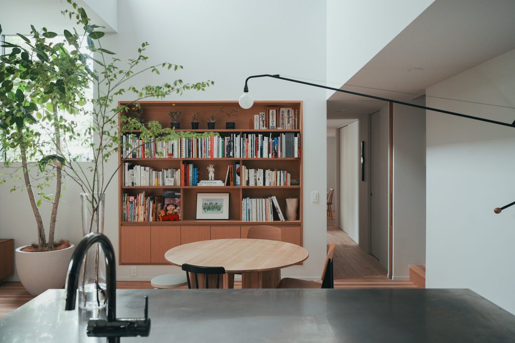 そして、白と木材のバランスにも配慮しています。壁と天井を白で塗装し、シンプルで落ち着いた空間に仕上げ、造作家具やキッチン、本棚には木材を使用し、自然な温もりをプラス。木の素材感が強調されすぎず、白とのちょうどいいバランスを取ります。床材には地元の杉を採用し、手が触れる部分には本物の木を使うことで、自然の素材に触れながら暮らす心地よさも大切にしました。